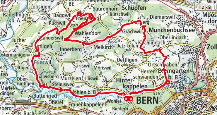Le parcours autour du haut plateau de Frienisberg offre une vue magnifique sur le Seeland, la ville de Berne et les Alpes bernoises. Le point fort du parcours est la tour Chutzen, haute de 45 m.