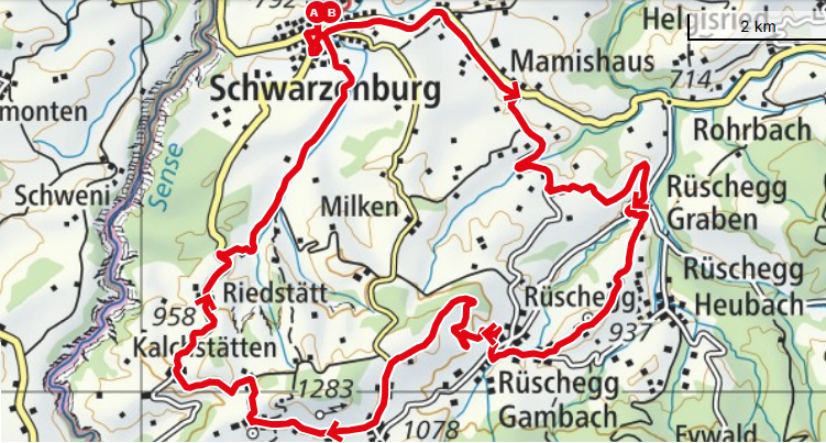 Magnifique balade en Ebike, avec des amis, dans la région du Gantrisch. Boucle depuis Schwarzenburg en passant par Mamishaus-Rüschegg-Gfell-RüscheggBach-Guggisberg-Riedstätten-Waldgasse. Visite du joli musée de Vreneli à Guggisberg